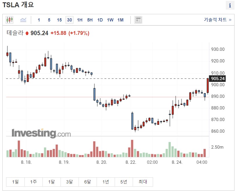 먼저 테슬라 주가를 실시간으로 확인할 수 있는 사이트를 소개 드립니다. 로그인을 하지 않더라도 실시간으로 확인이 가능하며, 각종 관련 뉴스를 추가로 제공받을 수 있습니다. 바로 인베스팅닷컴 입니다. 대략 짧은 주기의 테슬라 주가의 변화를 보고자 하니 주기는 30분 정도로 설정 해 두면 좋습니다.